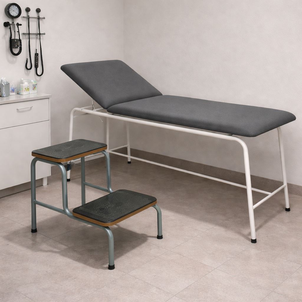 Escalera de 2 peldaños para uso en consulta médica, con 4 tacos de goma antideslizante en sus 4 patas para máxima seguridad. Cada peldaño está recubierto de goma antideslizante para evitar accidentes en la consulta médica. Su estructura de acero tubular permite soportar hasta 120 Kg.